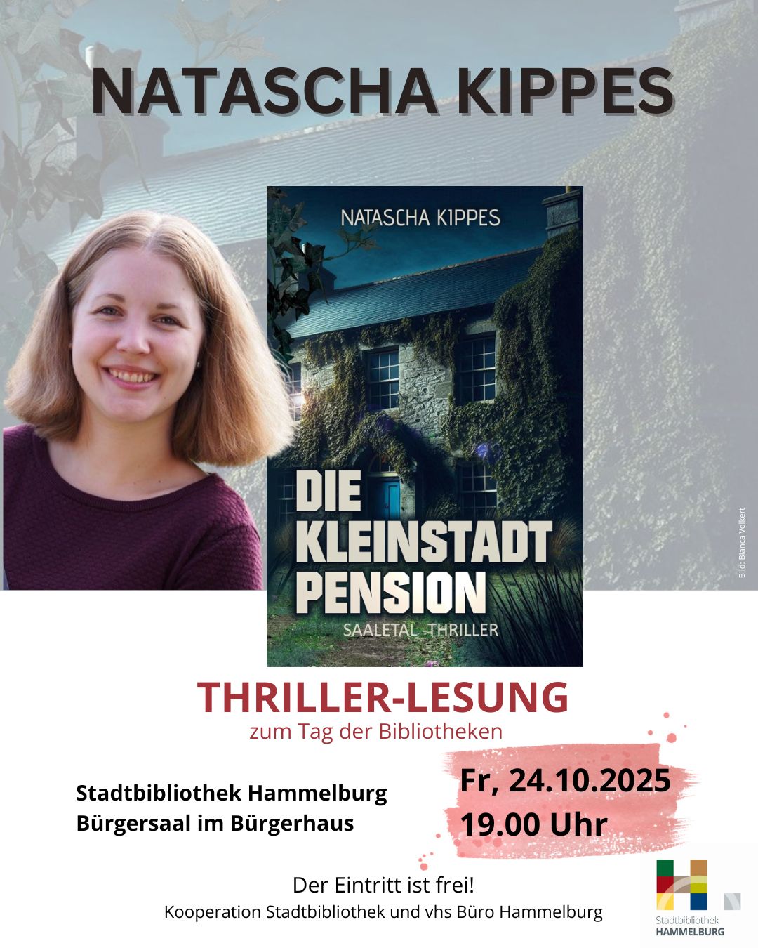Lesung von 19:00 – ca. 21:15 Uhr im Bürgerhaus Hammelburg (Marktplatz 15 in 97762 Hammelburg) aus meinem aktuellen Thriller Die Kleinstadtpension. Eine vorherige Anmeldung ist nicht erforderlich. Die Veranstaltung ist kostenfrei. Mit freundlicher Unterstützung bzw. in Kooperation mit der Stadtbibliothek Hammelburg.